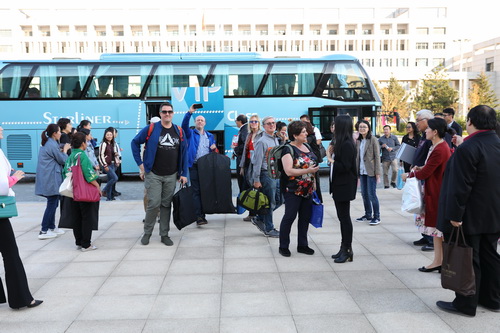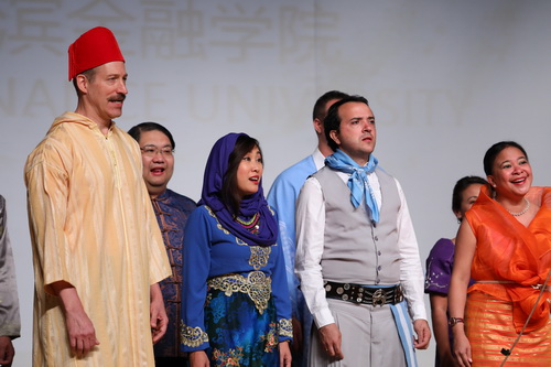 演出前,我院院长于沐琳,副院长张铁军亲切会见了联合国合唱团一行,对他们的到来表示了热烈欢迎。联合国合唱团团长Said Maalouf先生也表示,非常荣幸来到哈尔滨金融学院,非常荣幸能够在这里传播和平和友爱。合唱团的每名成员穿着不同的服饰,代表着世界各个国家和睦相处、团结互助。