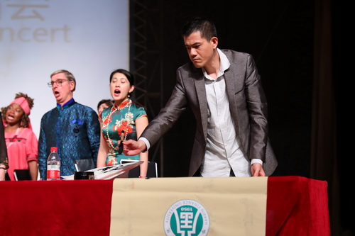 在最后一首曲目演唱中,法律系教师梁龙现场书写下我院的校训“以诚为金,礼融天下”,并由张铁军同志赠与联合国合唱团,将现场气氛推向高潮。