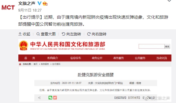 据文化和旅游部11日消息:近期,由于捷克境内新冠肺炎疫情出现快速反弹迹象,文化和旅游部提醒中国公民暂勿前往捷克旅游。