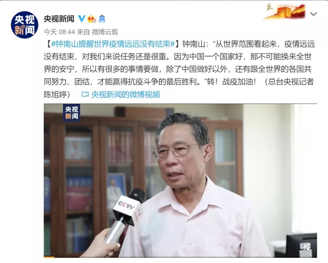 钟南山:“从世界范围看起来,疫情远远没有结束,对我们来说任务还是很重。因为中国一个国家好,那不可能换来全世界的安宁,所以有很多的事情要做,除了中国做好以外,还有跟全世界的各国共同努力、团结,才能赢得抗疫斗争的最后胜利。”