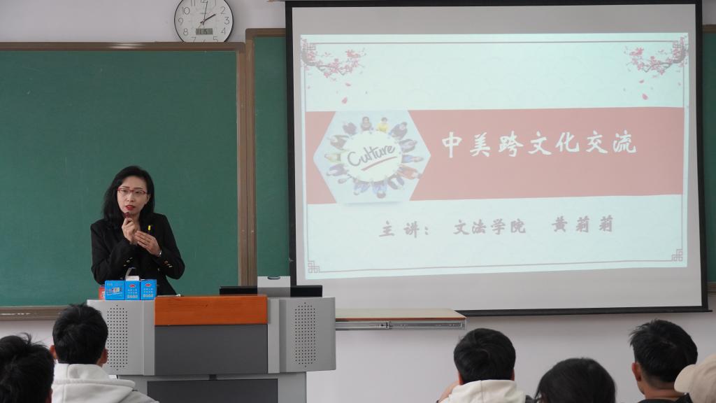 11月15日下午,在综合楼404教室如期举办了跨文化交流系列讲座第五讲。本次讲座邀请文法学院黄莉莉老师做了题为《中美跨文化交流》的专题讲座。来自不同院系的近五十名学生参加了本次讲座。