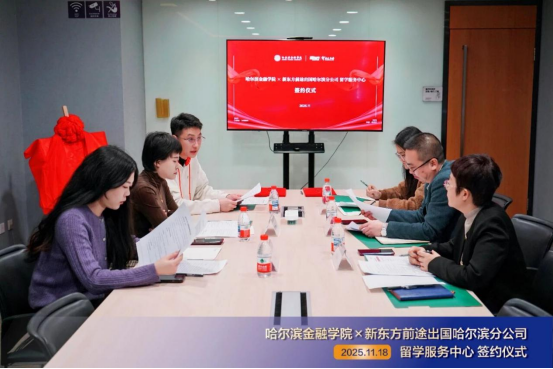 2025年11月18日上午10点,哈尔滨金融学院受哈尔滨新东方前途出国分公司邀请参加战略合作签约仪式。此次签约不仅是校企资源深度融合的重要里程碑,更标志着双方将携手为龙江金融学子搭建国际化成长新平台,共同开启国际化人才培养的全新征程。